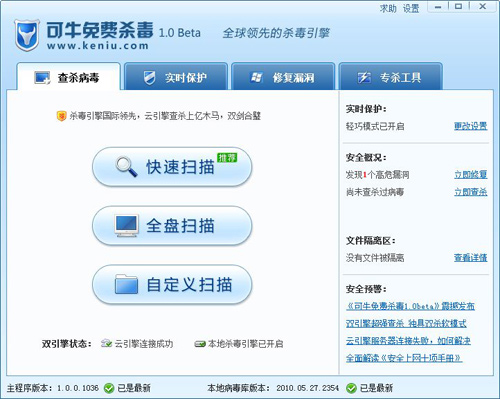 官方簡(jiǎn)介:可牛殺毒是一款完全免費(fèi)的殺毒軟件,它集成了全球領(lǐng)先的殺毒引擎,自主開發(fā)了高效輕巧的云引擎,完美清除傳統(tǒng)的病毒木馬; 獨(dú)創(chuàng)雙殺軟保護(hù)模式,可與傳統(tǒng)殺毒軟件一起保護(hù)系統(tǒng)。更有主動(dòng)防御、郵件防毒、漏洞修復(fù)功能,保護(hù)系統(tǒng)免受未知病毒侵害;可牛殺毒完全免費(fèi),查殺病毒快速、精準(zhǔn),資源占用少,為您的電腦提供超強(qiáng)、全方位保護(hù)。