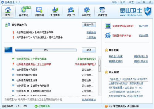 金山衛(wèi)士是三款軟件中最小的軟件,只有4.3MB,即使是集成V10引擎的金山衛(wèi)士完整下載包,也只有8.93MB,從網(wǎng)下下載很迅速,而下載完后幾步點(diǎn)擊即可迅速安完,完后自動(dòng)啟動(dòng)檢測(cè),過程也比較迅速,隨即就看到軟件的主界面了(圖2)。
