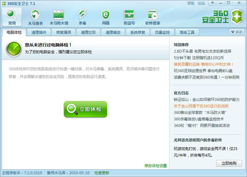 官方簡(jiǎn)介:360安全衛(wèi)士是當(dāng)前功能最強(qiáng)、效果最好、最受用戶歡迎的上網(wǎng)必備安全軟件。不但永久免費(fèi),還獨(dú)家提供多款著名殺毒軟件的免費(fèi)版。由于使用方便,用戶口碑好,目前3億中國網(wǎng)民中,首選安裝360的已超過2.5億。目前木馬威脅之大已遠(yuǎn)超病毒,360安全衛(wèi)士運(yùn)用云安全技術(shù),在殺木馬、打補(bǔ)丁、保護(hù)隱私、保護(hù)網(wǎng)銀和游戲的帳號(hào)密碼安全、防止電腦變?nèi)怆u等方面表現(xiàn)出色,被譽(yù)為“防范木馬的第一選擇”。360安全衛(wèi)士自身非常輕巧,查殺速度比傳統(tǒng)的殺毒軟件快數(shù)倍。同時(shí)還優(yōu)化系統(tǒng)性能,可大大加快電腦運(yùn)行速度。