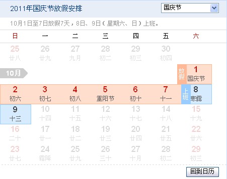 2011年國慶節放假安排:10月1日(星期六,國慶節)至7日(星期五)放假調休,共7天,10月8日(星期六)、10月9日(星期日)上班。