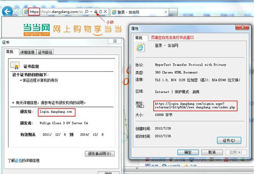 在網上交易的時候,為了驗證交易雙方身份、加密交易信息,保護交易安全,必然會使用證書來對交易相關的網頁進行加密,一個網站,一個證書,不可偽造,在頒發證書時,證書頒發機構都會對網站進行資質審核。所以在涉及到網絡交易,特別是涉及到錢時,例如,網絡商城的登錄、提交訂單、結算、網銀等的支付這些頁面必然是經過證書加密的。最明顯的特征是鏈接地址開頭部分由http變為了https,在IE里,地址欄會多一個小鎖。如圖: