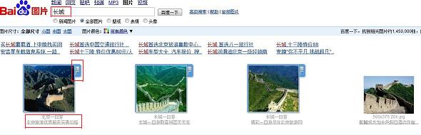 網友稱,在百度中搜索帶有“長城”關鍵字的圖片,在搜索結果中,排在前三位的長城圖片均帶有“推廣”標識,且暗含旅游公司網站的鏈接,而此前百度圖片搜索中只有文字鏈形式的廣告存在。