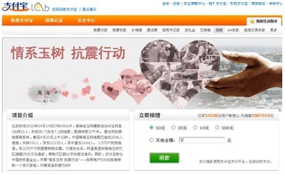 2010年以來,支付寶聯(lián)手中國扶貧基金會等慈善機構(gòu)在支付寶網(wǎng)站開通了專門的捐贈頻道,僅在過去一個多月時間里,支付寶就發(fā)起了“救助西南旱災(zāi)”、“思源水窖行動”以及“抗擊玉樹地震”等多個慈善捐款項目,號召網(wǎng)友和用戶通過支付寶賬戶捐款。