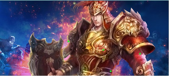 添加了火焰的光效,人物顯得比較動態鮮活,整個畫面更有一種對抗的戰火紛飛的感覺,但是現在整個畫面結合度還不夠高,這個時候我們往往會通過調整人物的色調和對比度等方法來使整個畫面更加和諧,但是不要漏掉一個重要的步驟就是環境色,可以通過在人物身上添加環境色來使人物和光效得到更好的結合,而且有質感的光效就像現在用的火焰,可以將材質疊加到人物的明暗面讓畫面更加真實生動(如圖中綠點標示部位)。最后,我們可以添加一些飄動的零散的火光,讓火焰的更有動感。
