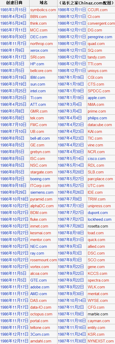 歷史上第一個.com域名的誕生是在1985年。當時個人電腦操作系統主要還是使用MS-DOS3.0操作系統,而剛剛成立的“戴爾” 的公司正準備發布它的第一款個人電腦“TurboPC”。1985年3月15日,symbolics.com注冊成為第一個.com域名。經營這個網站的公司是一家電腦制造商。Symbolics最初的所有者在90年代初宣布破產,后來的所有者繼續運營著這個網站。這也就是說symbolics.com是目前互聯網上最古老的運營中.com 域名,不過這個網站現在的界面還是非常簡單,就像1985年剛創建的時候那樣。其他的比較著名的早期域名包括1986年3月3日注冊創建的 hp.com(惠普域名),1986年3月19日創建的ibm.com(IBM域名),1986年4月25日創建的att.com(AT&T域名)等。